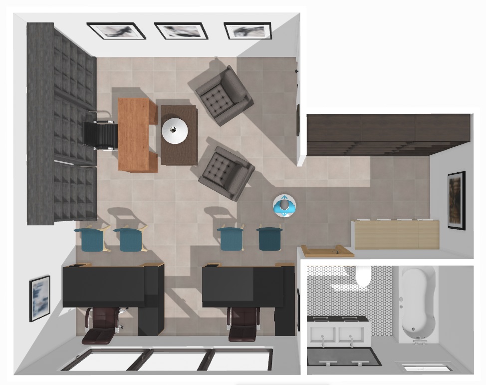 Oficina de un solo ambiente con baño privado.